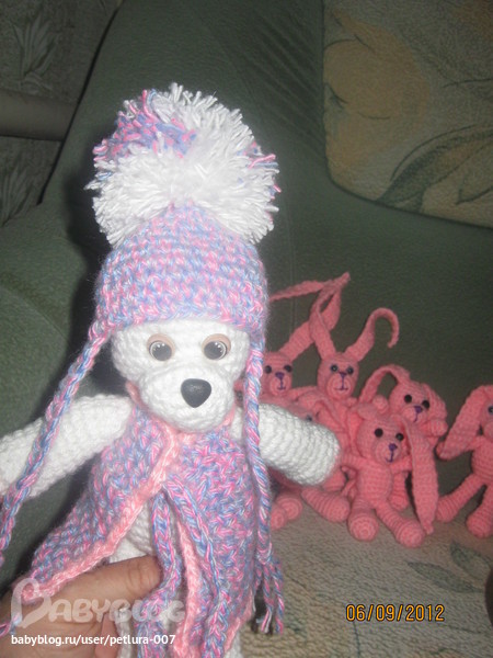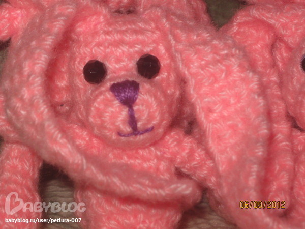 Кролики связаны крючком....ростом 12-13 см...набивка - холофайбер....глазки пластмассовые и бусины-не хватило на всех одинаковых)))) еще к Кате поедет Мишка)))) надеюсь ей все понравится
