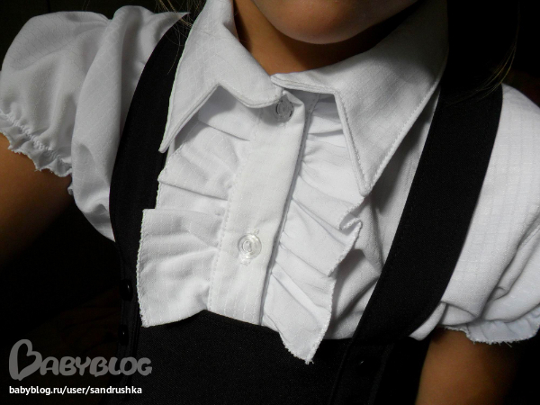 Блузка все по той же выкройке из Ottobre 2007-1, что и первая. Ткань другая, в мелкий квадратик. Еще воротник сделала уголками и добавила жабо, чтобы рубашки как-то отличались друг от друга )) Ну и рукава собрала на резинку, а край обметала.