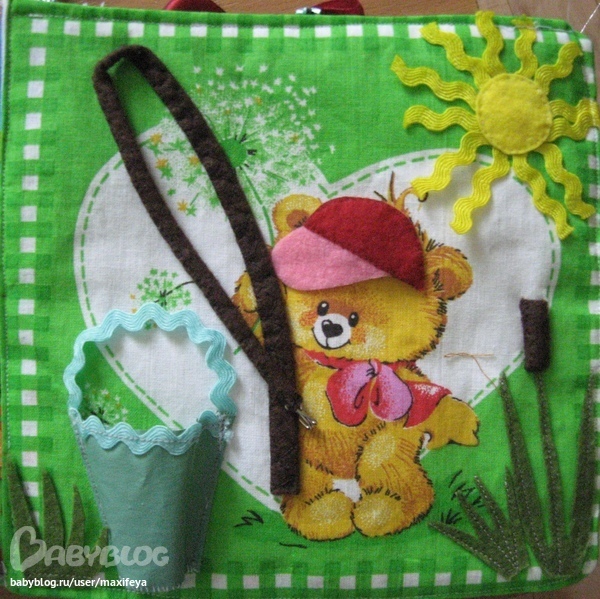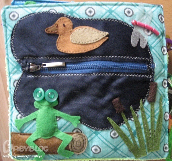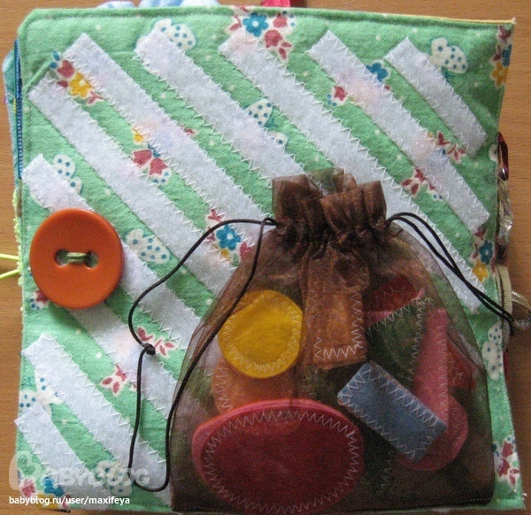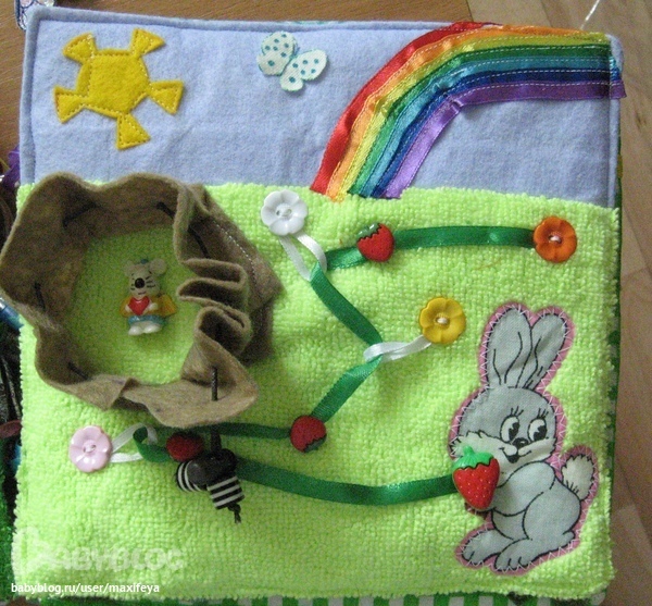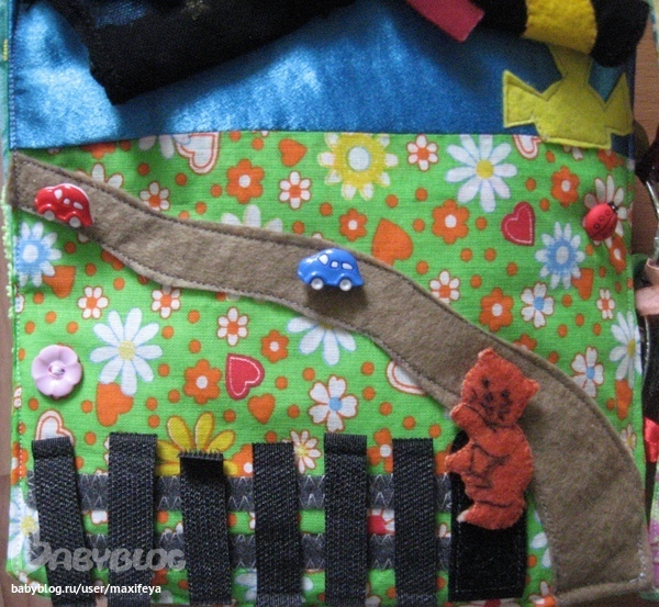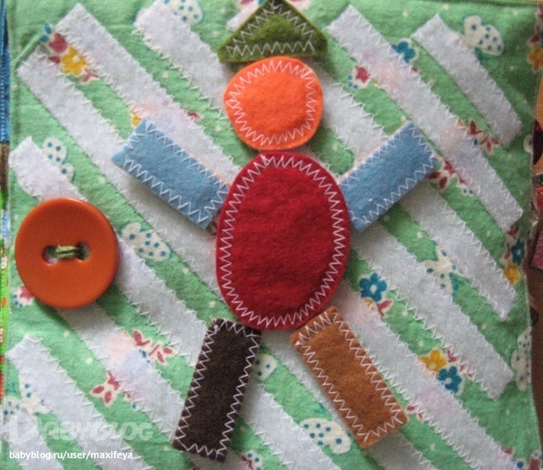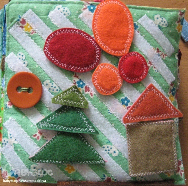 Последняя страничка - что-то вроде доски для рисования. На липучках разные фигуры, можно изучать формы, цвета, понятия "большой-маленький", "одинаковый-разный". И просто рисовать то, что придет в голову: