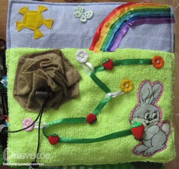 "Полянка": продвигая ягодки по ленточке и просовывая в петельки, кормим зайку. А раскопав норку, можно найти мышонка.