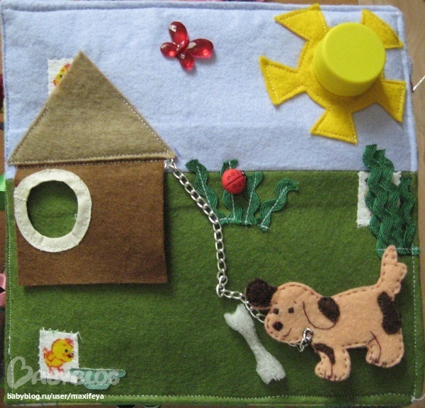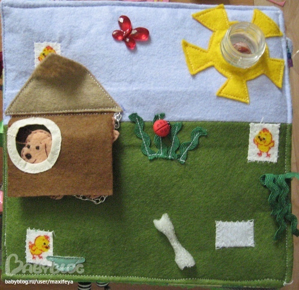 "Двор": собачка на липучке, может ходить по двору и прятаться в будке, крышка у солнца откручивается, внутри бусинки на резинке, достать не так-то просто! Ну и ищем цыплят: один у миски, другой на крыше будки, третий в траве.