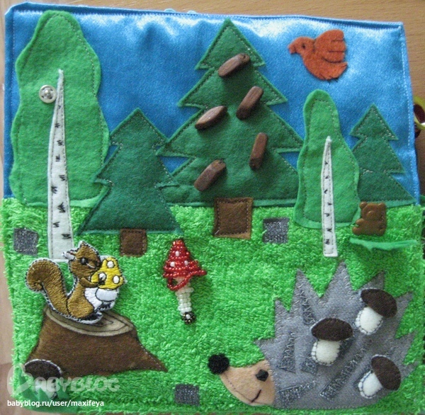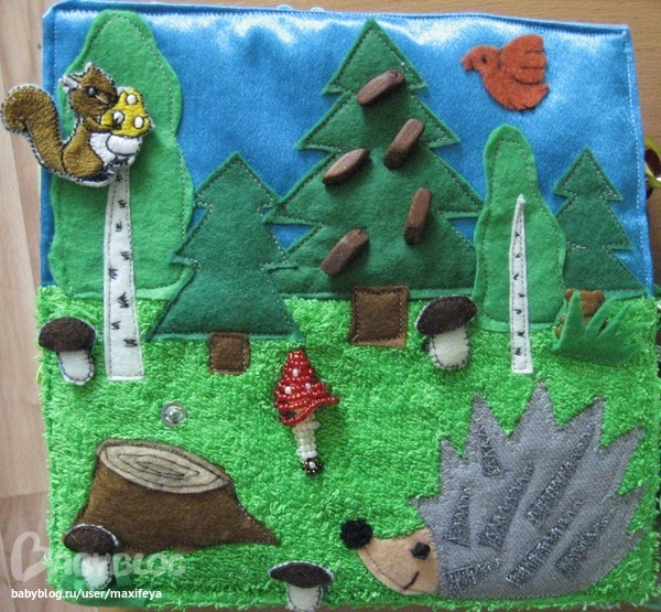"Лес": помогаем ежику собирать белые грибы (на липучках), белочка на кнопке, может спрыгнуть на пенек, который шуршит, а в травке сидит медвежонок. Здесь можно изучать понятия "большой-маленький", "есть-нету" (шишки на елках), съедобные и ядовитый грибы.