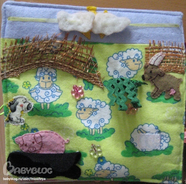 "Луг": в луже купается свинка, корова на липучке, может погулять и забраться в огород, в кустах еще один барашек. Облака можно двигать и закрывать солнышко.