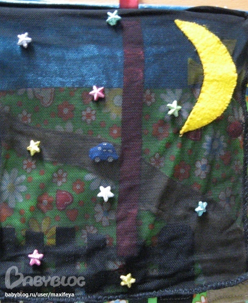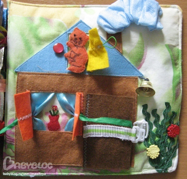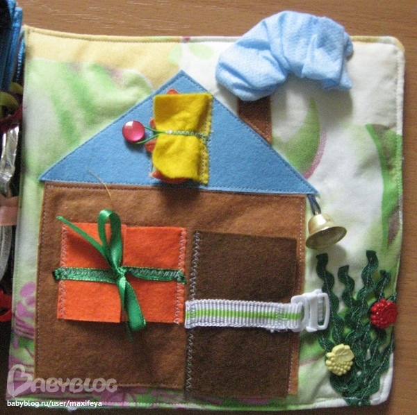 "Домик": тут разные застежки, дым из трубы на резинке, за дверкой прозрачный кармашек, там позже будет дочкина фотография.