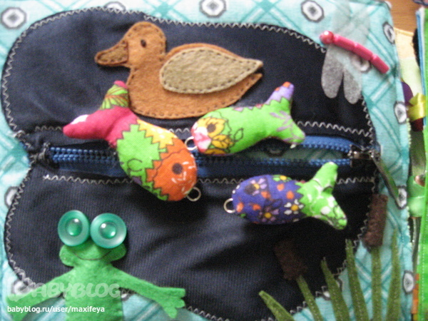 "Пруд": бревно шуршит, лягушонок пришит не полностью, может хлопать в ладоши и дрыгать ножками. В пруду рыбки.
