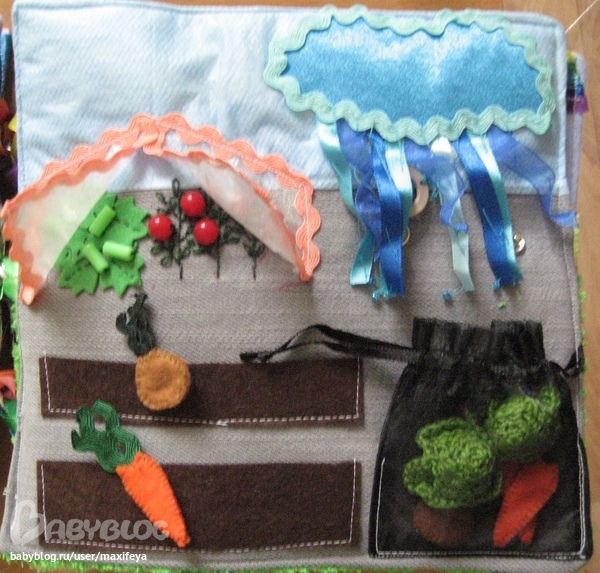 "Огород": морковка и лук - в грядках-кармашках, капуста на кнопках, их можно собирать в мешок. В теплице огурцы и помидоры - можно пощупать. Дождик можно по одному вытянуть из тучки, а потом, дернув за кольцо на веревочке, вернуть обратно.