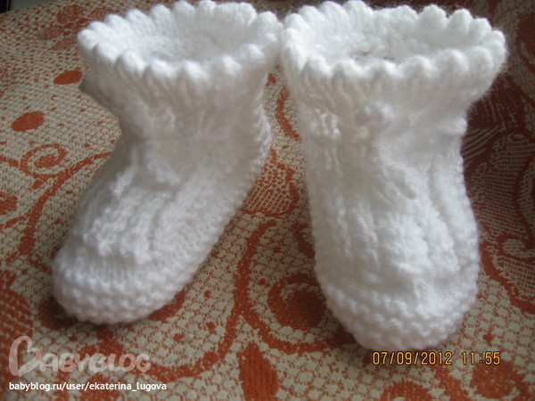 Повязать желаемую длину пинетки вверх, закончить так: 6 рядов чулочной вязки, 1ряд с дырочками, 6 рядов чулочной вязки. Закрыть петли, сшить пинеток, подогнуть зубчатый край и подшить с изнанки. Связать крючком шнурок и продеть.