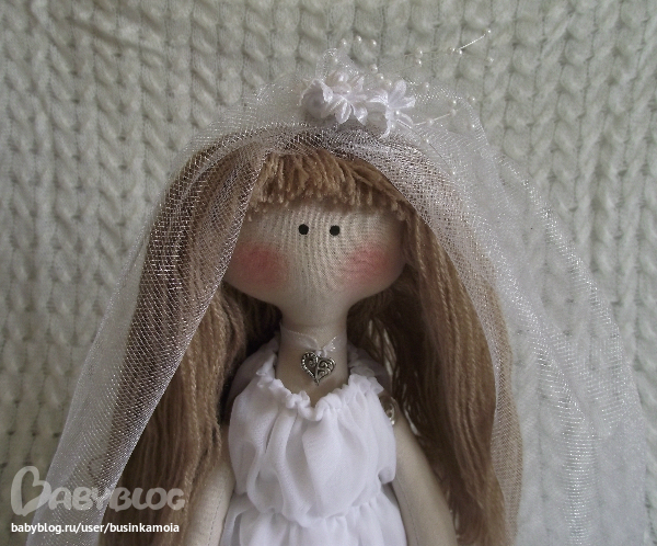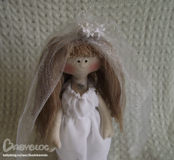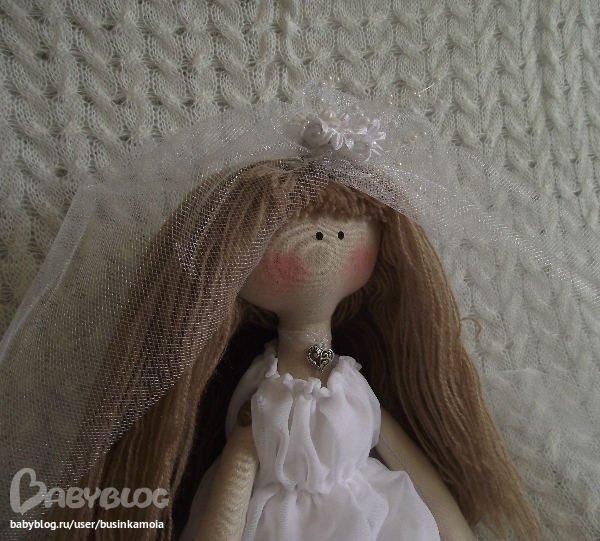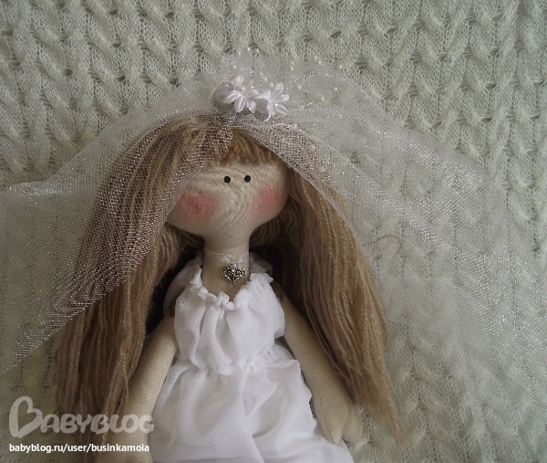 Доделала куколку для дочу знакомых, как и просили в оразе невесты, так как она предназначалась для игры, то сделала ей волосики из пряжи (это скажу вам жесть - прошивать каждую волосинку по отдельности, что ни чего в последствии не вывалилось...) и простеньгое платьице, перегружать аксессуарами не стала.
