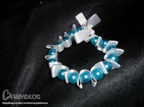 отступила от края летны около 15 см и собрала складочку, взяла иголку с толстой ниткой и сделала прокол ее проколов полностью потом насодила бусину и по ее размеру сделала2-ую складочку чтобы она красиво лежала в ней, и так по очереди у меня вышло 16, потом взяла 2-ую иглу с ниткой и сделала 2-ой ряд так же))) завязала узлами с двух концов и соединила бантом)))) вот и все, заняло минут 40 наверное