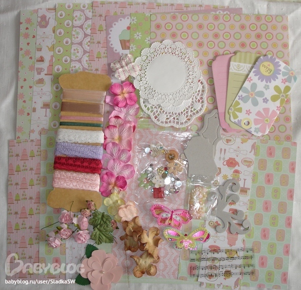 в первом розовом наборе 13 листов 20*20 + несколько начатых листов, которые можно использовать как подложку для фото,набор из лент 4 атласных+4 вида кружево, много различных цветов плоских бумажных и объемных, два вида салфеток, полу жемчуг персиковый,розовый и жемчужный, брадсы , пуговки, стразы,картонная вырубка-рамки.