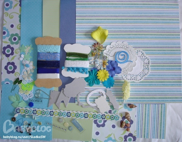 Второй мальчиковый 6 листов 30*30 +9 листов 15*15, 2 набора лент,2вида салфеток, вырубка бордюр и рамки, вырубка бабочки, флажки, бумажные плоские цветы, эпоксидные наклейки, стразы, пуговки, брадсы, люверсы.