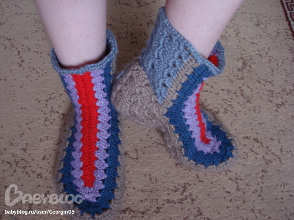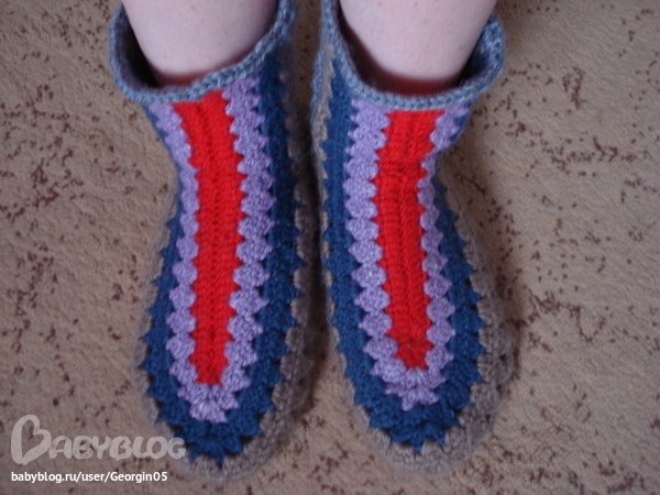 ... тоже для себя вязала еще прошлой зимой. Из самой дешевенькой пряжи, что на рынке бабульки продают. Подошва специально так связана, чтоб в случае если носки поизносятся, можно было заменить не распарывая носок полностью. Т.к. это второе их преображение. Рука не поднялась их выбросить. Нравятся они мне и все тут.