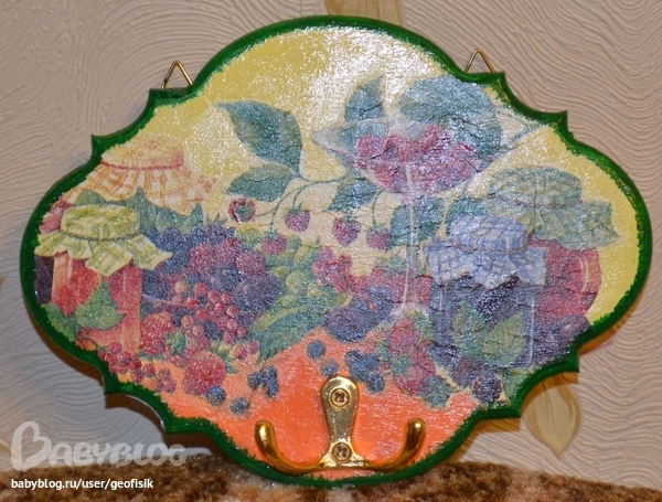 ДекупажКонечно, лето меня от рукоделия отваживало по-тихоньку, но я упрямилась и не сдавалась)))))) В результате, в период НЕИМОВЕРНОЙ усталости, в руки быстро попалась заготовочка под вешалку для полотенец... Очень люблю функциональные вещи)))) Всё предельно просто: заготовка, грунт, салфетка и акриловые краски для подрисовки фона и окантовки....