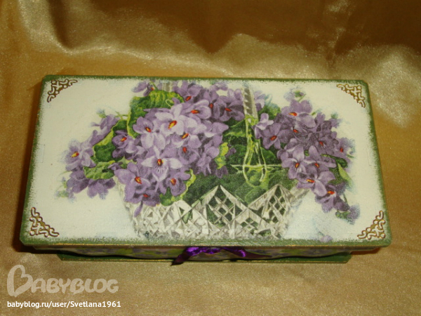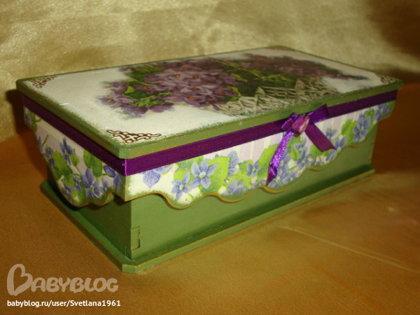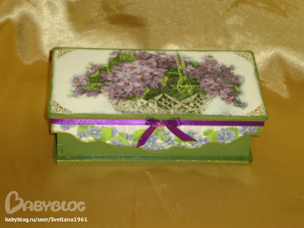 Светлана в Рукоделие 13 лет Шкатулка-купюрница "Букет фиалок" Декупаж Посмотрите еще 20 записей на эту тему Отменить Ответить Алёнушка Хорошенькая шкатулочка! 10.09.2012 Ответить Виктория Очень красивый букетик!! 09.09.2012 Ответить Ключница и вешалка Деревянные заготовки для росписи и декупажа...салфетки Чаты Беременных Выберите чат: Январята-2026 Февралята-2026 Мартята-2026 Апрелята-2026 Майчата-2026 Июнята-2026 Июлята-2026 Августята-2026
