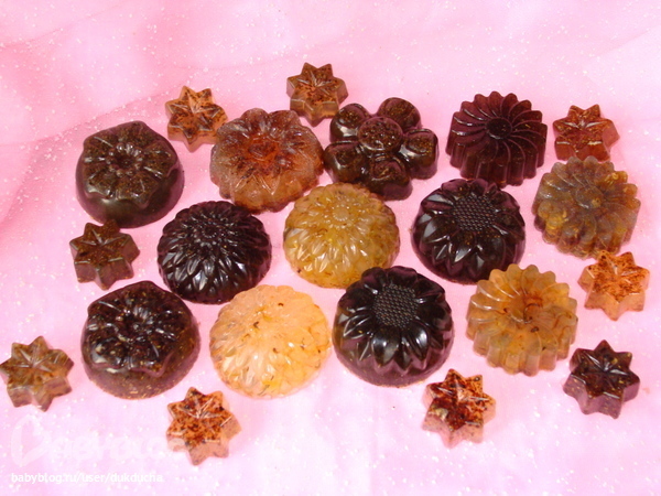 Все выполнены в форме разнообразных цветочков, на заказ возможны машинки, львятки, снежинки, простые овалы и многие другие))