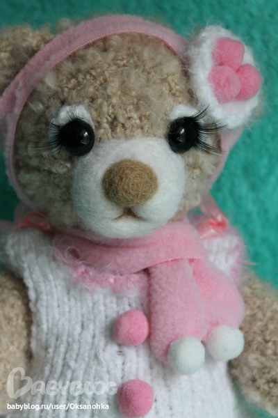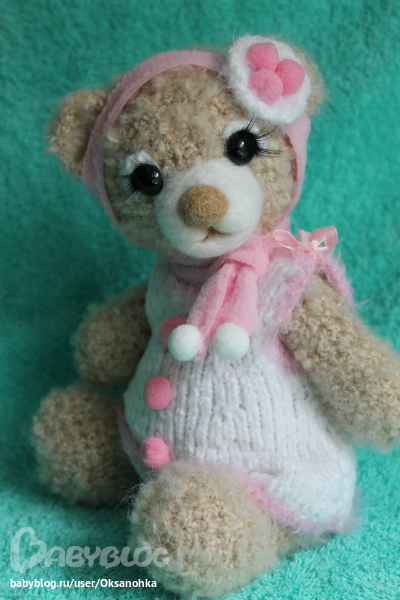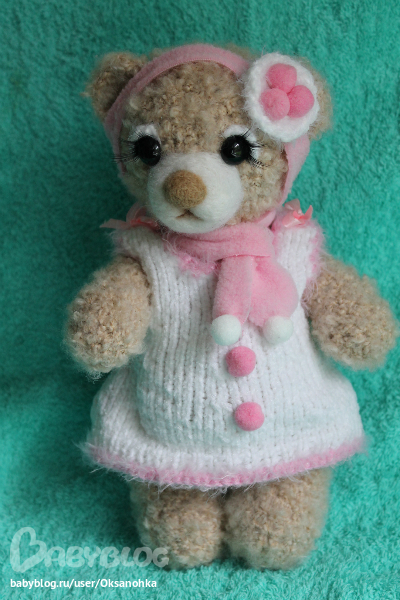 Игрушечный мир - животныеМишка связана из фактурной пряжи, 6 шплинтов, мордочка - сухое валяние, одета в сарафанчик из велюровой пряжи, украшенный пушистыми помпонами. Ростом 26см.