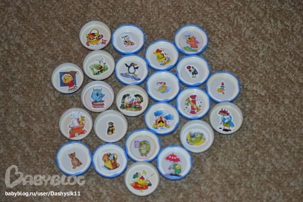 Я конечно не первооткрыватель, думаю все уже где-нибудь да видели этот нехитрый способ занять свое чадо хоть на какое то время, чем-нибудь интересным и познавательным! Вот делюсь, что сделала буквально за 10 мин., пока доча спит. Может кому пригодится. Обычные крышечки от детского питания и завалявшиеся наклейки превращаются....