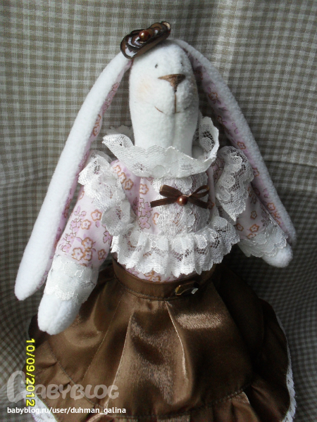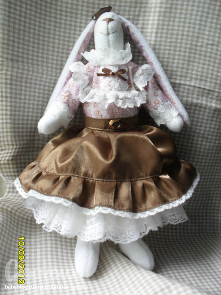 Опять работа получилась в четыре руки))Мама знала какую зайку я собираюсь шить,из какой ткани)Я всегда с ней делюсь моими идеями))) Вот она и решила тоже попробовать)))Надеюсь Татьяне понравится зайка,и ничего страшного не будет в том что половину шила не я)) Ведь получилось очень красиво ( на мой взглад) и я бы так не смогла))))