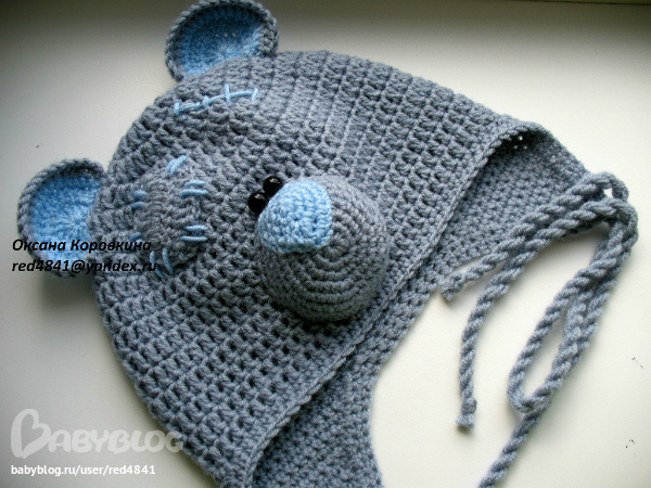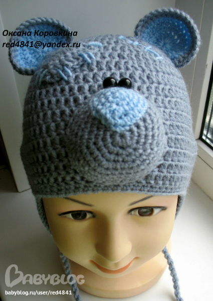 начиная с 12 с т.с н ...,прибавки по 12 ст.с.н в каждом ряду,но после 12 см диаметра через ряд,круг до нужного диаметра..потом прямо....до нужной глубины...ушки по 15 ст.б.н...убавки в каждом ряду с двух сторон по 1 ст.....обвязываю по периметру всей шапочки еще 2 ряда ст.б.н. ввязывая попутно завязки
