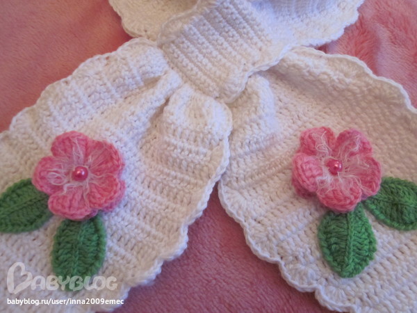 очень красиво! шарфик оборачивается вокруг шеи два раза? а нет ли фото подобной вещицы на ребенке?