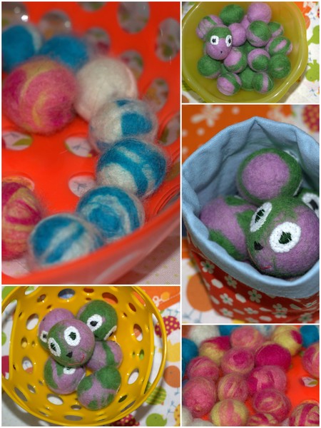 Фелтинг (валяние шерсти)Наваляли мы с Катейков шариков две миски большие! Ручками так много не получилось бы, а вот стиральная машинка отлично валяет! Здесь мк. Одни шарики побольше, около 5 см в диаметре, другие поменьше, 3-4 см.