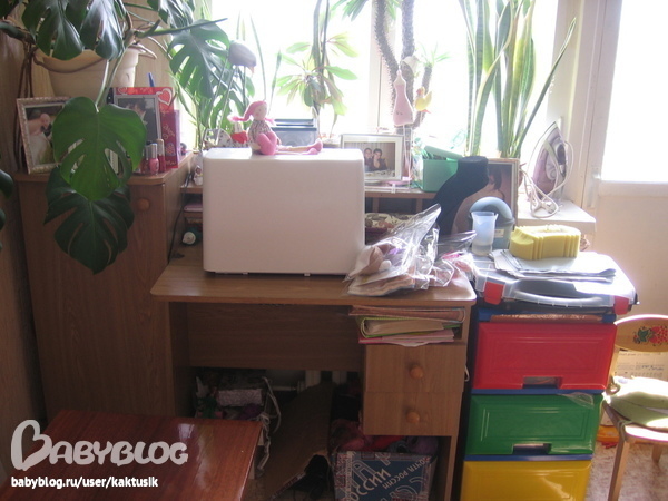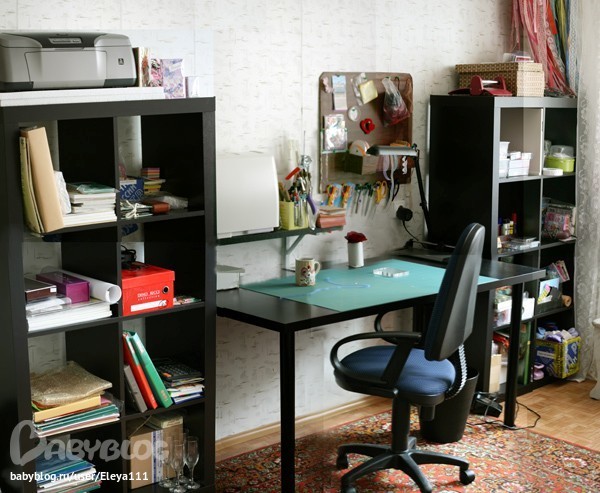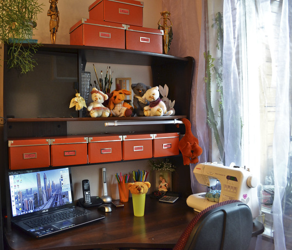 У меня так :-) Рабочее место в гостиной, поэтому вся мелочевка убрана в коробочки и ящички для порядка.)))