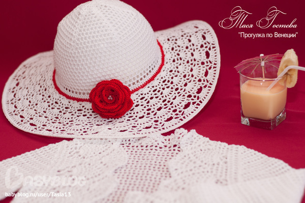 мое любимое болеро, только тут съипровизировала длинные рукава. В комплект ажурная шляпка с широкими полями.
