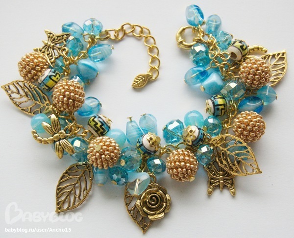 Браслет выполнен из бусин, оплетённых чешским бисером, керамических бусин, чешского стекла, гранёных бусин и фурнитуры под золото.