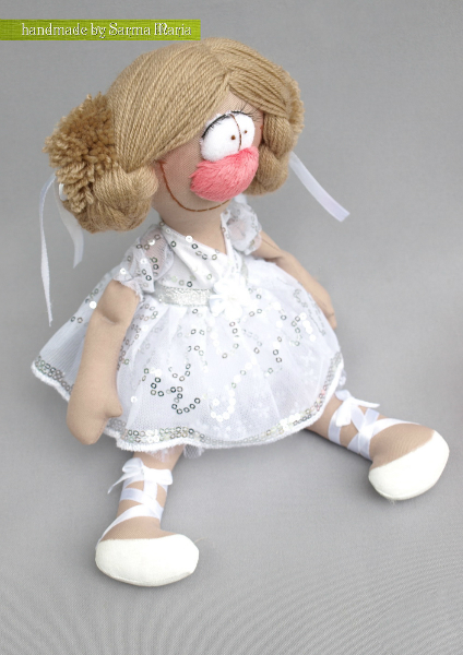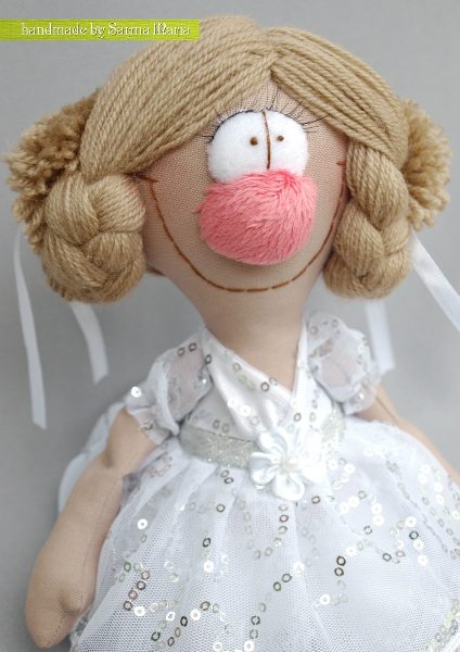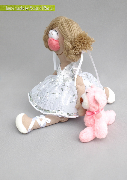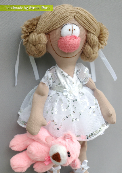 Куколка создана для маленькой принцессы, поэтому волосы из пряжи, а мишка крепится на липучку к руке куколки)