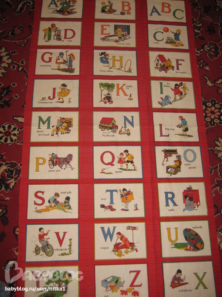 а я бы сделала мягкую книжку или настеную доску вставила поролон и пришила бы эту ткань был бы английский алфавит .правда бы сделала впритык буквы а то она так большая выходит)