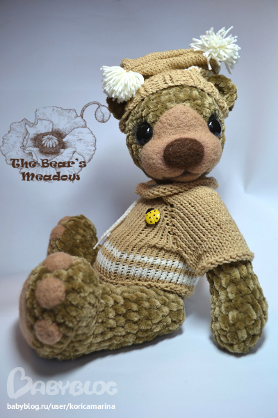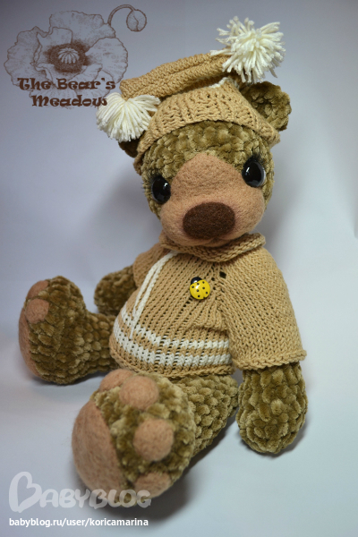 Илюша связан из плюшевой пряжи, наполнитель синтепон, винтовое крепление, ножки/ручки/голова вращаются, глазки, реснички, шапочка и свитерок связаны из хлопка, пуговка"Божья коровка", мордочка привалена шерстью, немножко тонирована пастелью