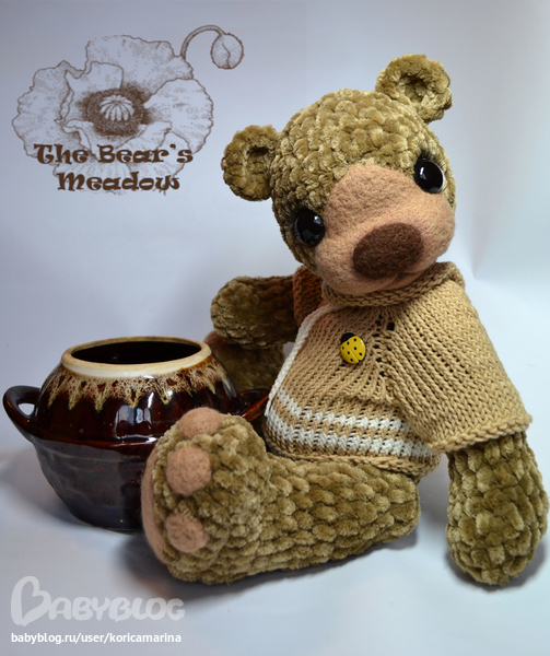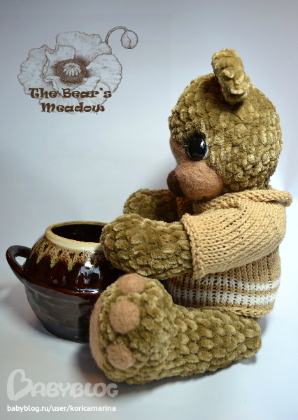 Игрушечный мир - животныеПознакомьтесь, это мишка Илюша! Росленький мальчик, около 37см! Очень сильно любит мёд! Уже добрался к НЗ (нетронутый запас))и вот, я захожу в комнату.........а горшочек почти пустой!! Ну, что ж тут поделать, осталось взять фотоаппарат и запечатлеть этот момент)))))