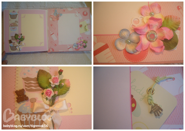 Лена, я по Вашей просьбе с критикой ))) В целом цветовая гамма приятная. Альбом смотрится нежно. Но, если присмотреться, все слишком пестро. Надо либо на спокойной бумаге использовать яркую декорацию, либо наоборот. У Вас получается, украшения спорят с фоном. Появляются лишние по колеру цвета (на страничке с красивыми розовыми цветами вдруг оранжевые да еще с голубым цветы, на другой страничке дырокольные листочки совершенно другого холодного цвета). Замечательные кексики, вдруг бац! на них букетик. Приходится разглядывать, что же это такое? Одно другое перебивает.Тесьма с надписью baby и на другой странице с кружочками совершенно невыигрышно смотрятся. Их просто не видно на фоне пестрой бумаги. Главное правило декоратора - использовать максимум три цвета (иногда четыре, часто два из них близки) плюс белый, черный, серый. Походите по блогам с заданиями. В Контакте часто втречаются предложения цветовых решений. Посмотрите цветовые сочетания. Цвета либо теплые, либо холодные. Вы нигде не найдете розовый, оранжевый, голубой и зеленый в одном замесе, да еще такие активные.