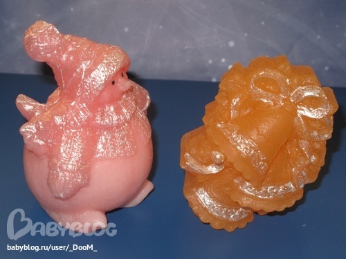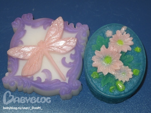 В Пухлике 180 г, а пахнет розой и малиной. В колокольчиках отдушка персиковый смузи.Барашки пахнут кофе, а ежик орхидеей. В стрекозе отдушка звездная пыль, в шкатулке - Дольче Вита. В белых анютиных глазках отдушка лилия, в оранжевых, букетике роз и вазочках с розами отдушка свежесрезанные розы. Все пахнет очень вкусно и даже лилия.