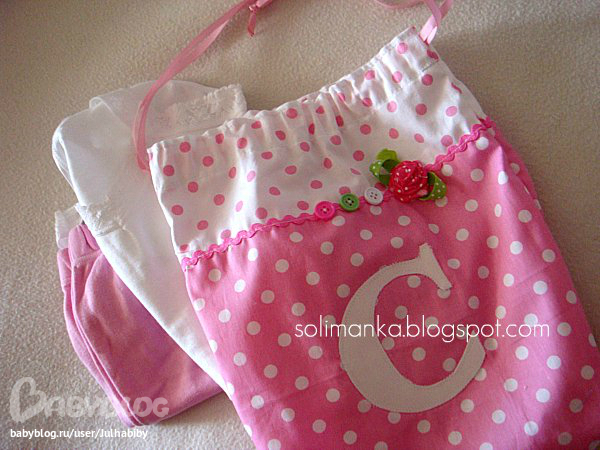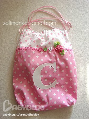 Итог: Порылась в закромах, выгрузила все имеющиеся ткани перед дочкой. Выбирай..Дочь, как настоящая..девчонка, выбрала розовое ((хотя я розовое не очень люблю) Но это же ее мешок! Пришлось шить из розового.Вот такой милый и простой получился мешочек