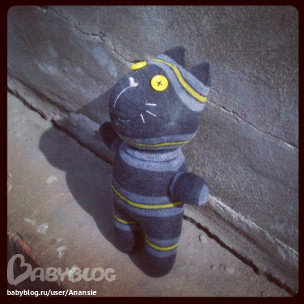 Пока я была в отпуске, в гости приезжала подруга со всем семейством. Дело было первого сентября, ее сын пошел в первый раз в школу и я решила сделать ему подарок. Накануне сшила вот такого кота:
