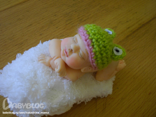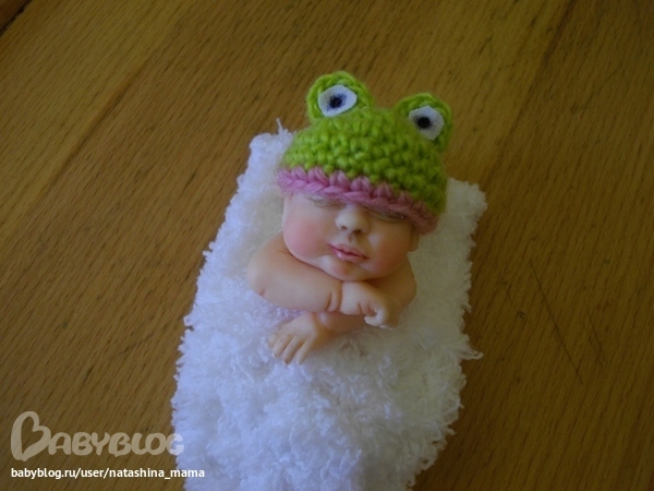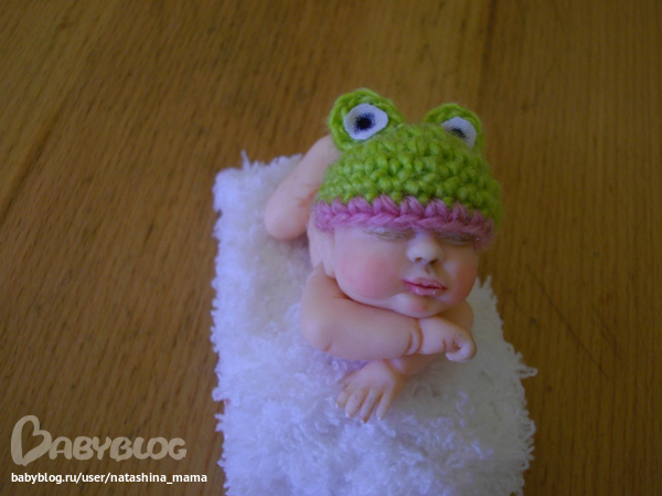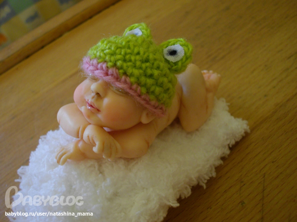 Девочки, всем привет! Мой маленький домашний роддом продолжает свою работу))))) Посмотрите, кто у меня сегодня - маленький Лягушонок! Маленькая, смешная, беззащитная девочка! Ростик 7 см, слеплена из полимерной глины Фимо Паппен, шапочку вязала крючком, личико расписано акрилом, складочки и ноготочки тоже проработала акрилом.