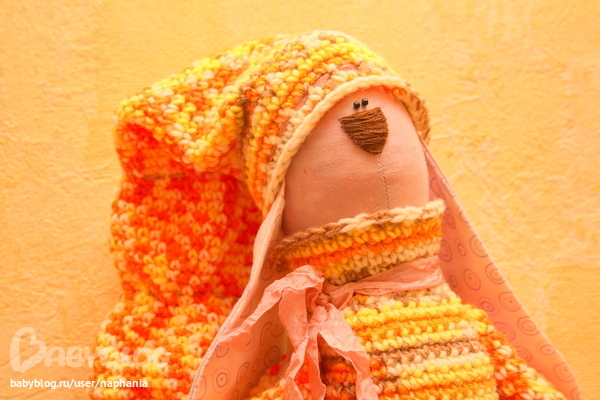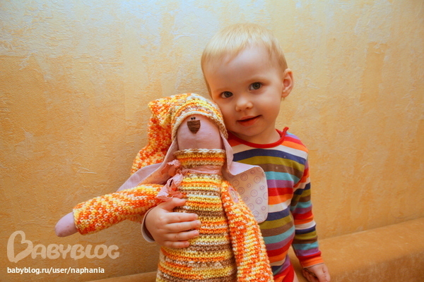 Игрушечный мир - животныееще один "тискательный" зайка и тоже в подарок, только уже не маленькому ребенку поэтому глазки - бисеринки. Свитер и шапочка связаны крючком, декорированы лентой. На штанах комикс с добрым приведением