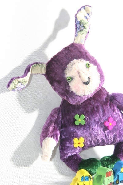 У зайчика 3-шплинтовое крепление конечностей, наполнитель холлофайбер и мелкие морские камушки, глазки от "Шерстяной лампочки". Тонирован акрилом и масляной пастелью.