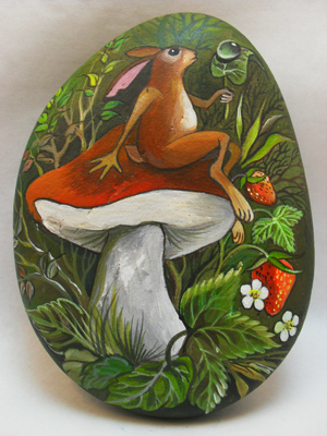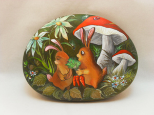 Краски - акрил. Набросок, как таковой не делаю. Сначала коричневым акрилом набрасываю контуры - потом крашу. Как вариант - сначала карандашный набросок на бумаге, потом, глядя на него - сразу расписываю булыжничек))) конкретно так рисовался зайко с росинкой)