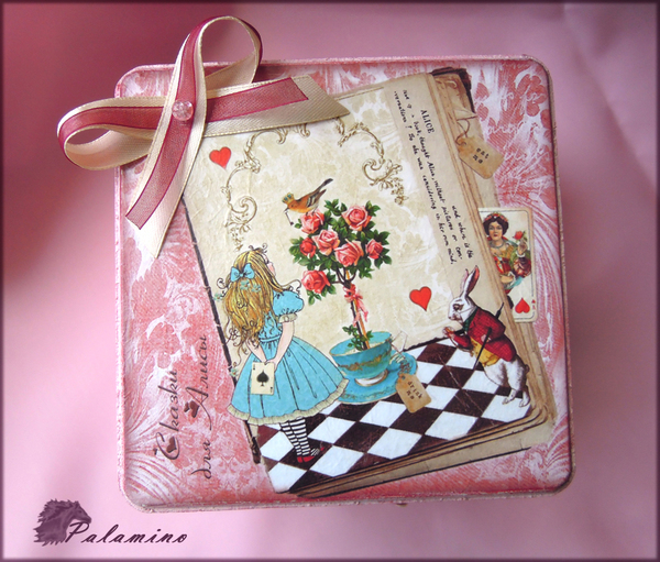 ДекупажМоя крестная дочка ну оооочень любит всевозможные мотивы из " Алисы в стране чудес" ...и не удивительно - ведь ее зовут Алиса. Эта шкатулка делалась для нее, в фотошопе прямо на мотиве я так и написала " Сказки для Алисы".
