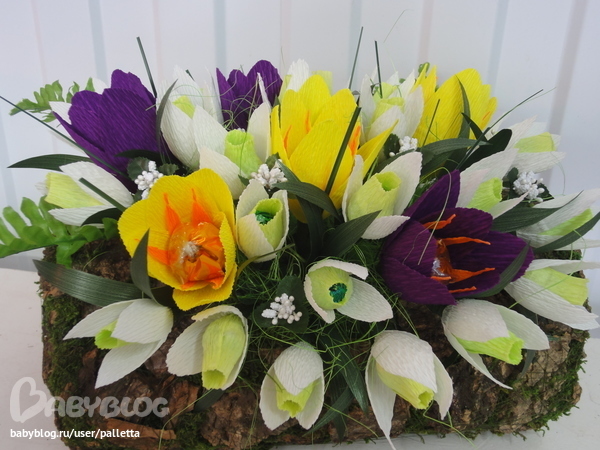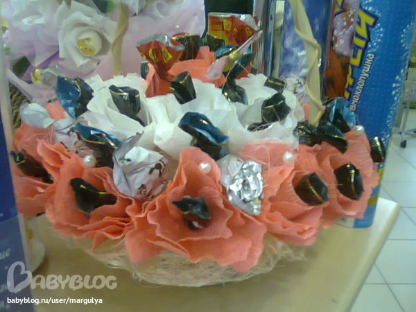 Рит,я в рошлом году в Вавилоне Золотом в отрадном видела...корзинки с крокусами и непонятными цветами за 2 тыщитакое уродство по мне я даже в первый раз бы если начинала не сделала, а продавать бы так и речи б не было. Благо сейчас у них опять продают только конфеты на разновес )))Ха ха ха наверное такое г...долго стояло