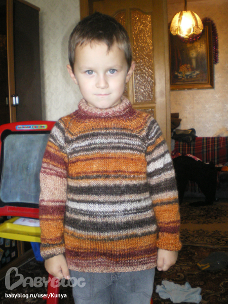 классный свитерок получился, такая теплая расцветочка! (у нас из такого же мохера шапка осенняя прошлогодняя была http://www.babyblog.ru/user/photo_pic/delta84/890723 ))))