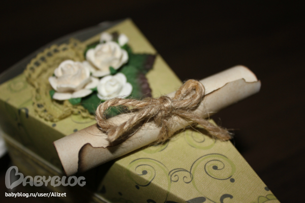 СкрапбукингТакая коробочка получилась у меня к маминому дню рождению, в ней поместился сам подарок-куча лаков и косметики) Мама осталась довольна, она вообще любит все мои рукоделки получать в подарок. Пергамент состарен кофе и с подпаленными краями, на нем поместилось стихотворение)