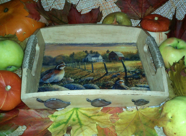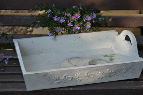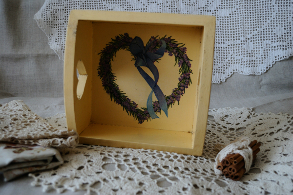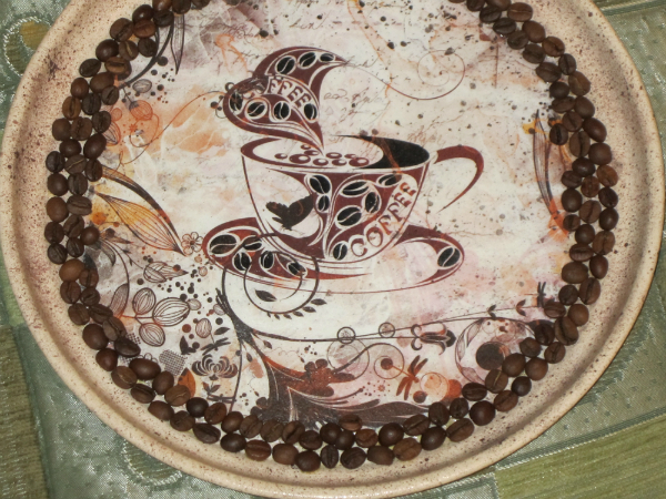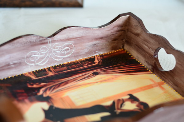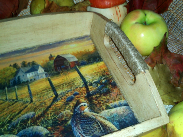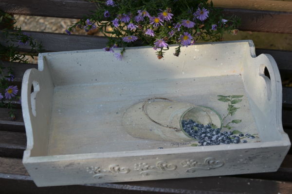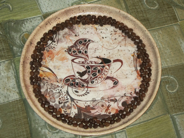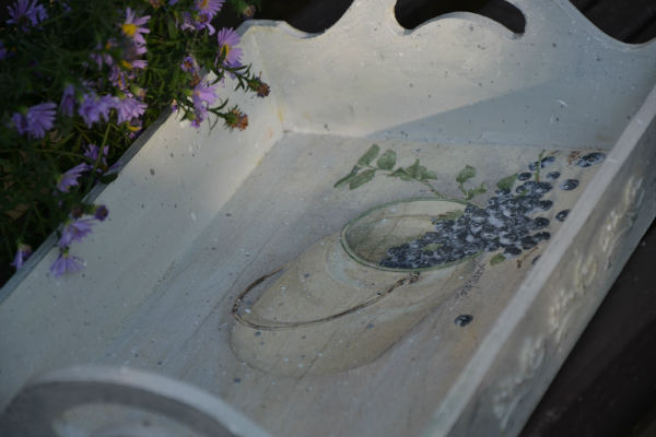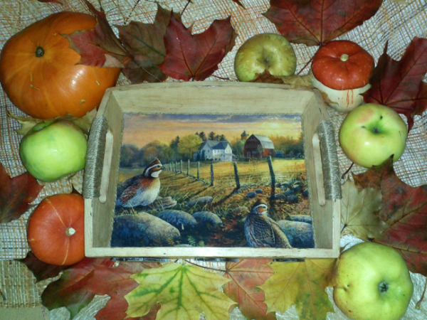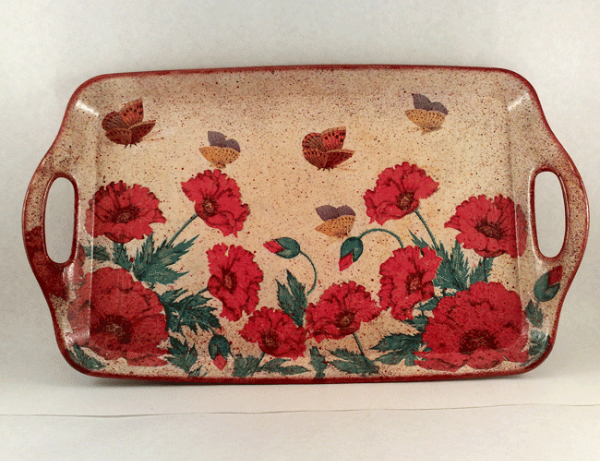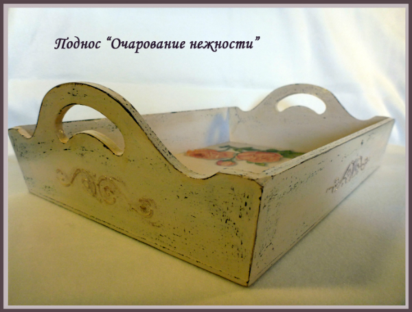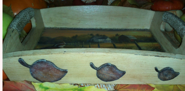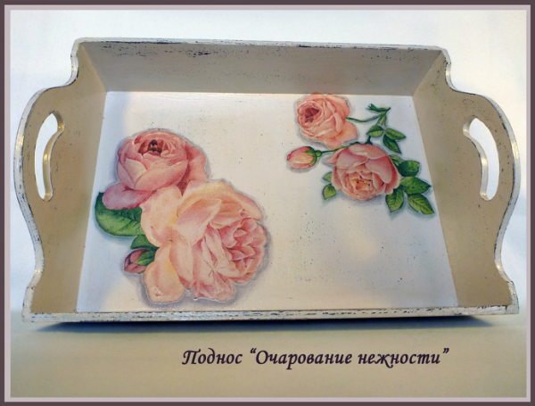 Материалы: пластиковый поднос,салфетка два вида,трафарет, акриловые краски, контур, лак яхтный