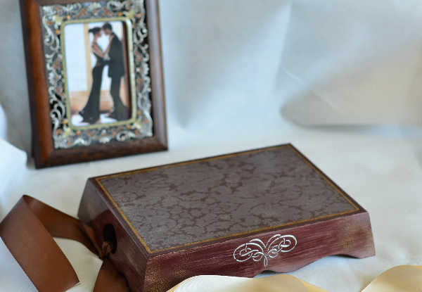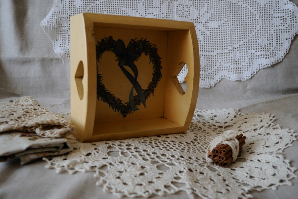 Ход работы: загрунтовала, покрасила в коричневый цвет, натерла всечкой, покрасила в молочный цвет, пошкурила места где натерто свечкой, сделала узоры через трафарет, приклеила мотивы, сделала тени пастелью, покрыла лаком.
