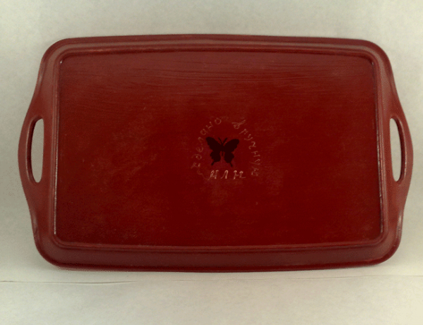 Материалы: поднос пластиковый. Краски акриловые (белый и красный цвет),лак акриловый глянцевый, лак акриловый шелковисто-матовый Поли –Р,Кракелюрная пара маймери 753,754, тени для век, контур для керамики белый, шкурка, распечатка, трафарет, шпаклевка, клей акриловый, клей ПВА.