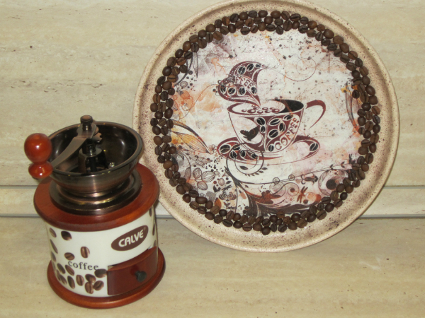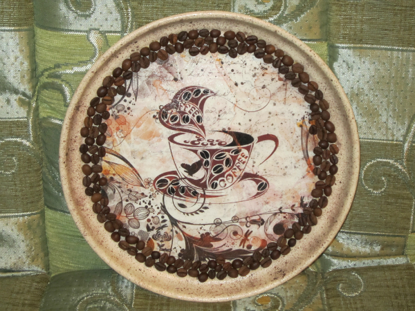 Материалы: распечатка, акриловые краски, лак, зерна кофе.