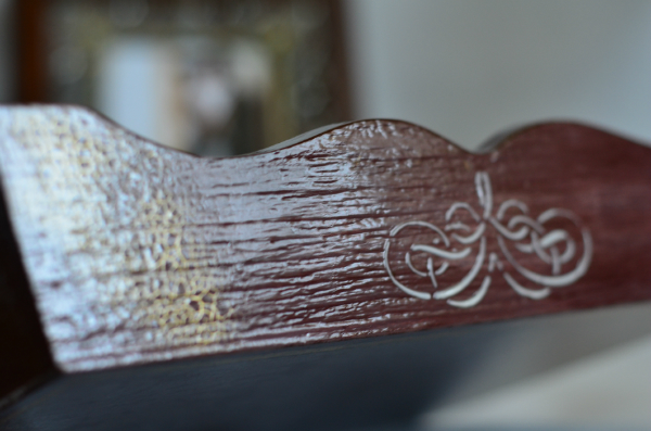 материалы и техники: деревянная заготовка, салфетка, распечатка, акриловые краски, лак, текстурная паста, контур, воск; прямой декупаж, браширование, морение акрилом, лессировка, вживление салфетки, двухшаговый кракелюр, затирка золотым пурпурином, объём через тарфарет, обработка воском.