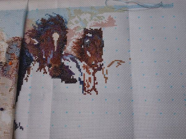 Привет, девочки! Второй день не могу ничего сделать с фотоаппаратом, младший его "слегка" уронил... Поэтому додумалась-таки сделать фото на мобилку ... В общем, было:  И стало:  На этой неделе лошадями, возможно, совсем не займусь: у нашего знакомого день рождения, нужно срочно вышить подарок :) Какой - пока не скажу, но сюжет необычный, потом сами увидите :)